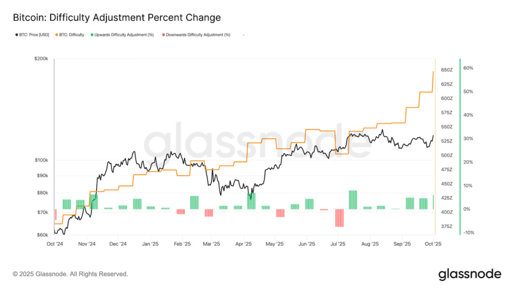 ビットコインのマイニング難易度が10月1日に5%上昇し、過去最高の150兆8400億に達した。グラスノードによると、これで7回連続の上昇となった。