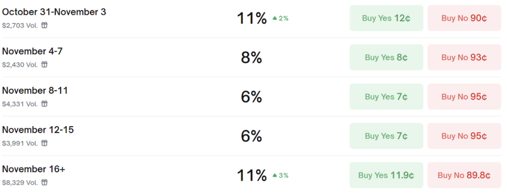 政府閉鎖関連の契約を精査した結果、ポリマーケットの参加者は連邦政府の業務再開を10月下旬から11月上旬と見ており、コンセンサス予想では10月30日頃となっている。