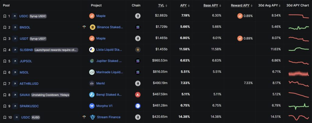 DeFiLlamaのデータを見ると、Maple、Lista、Stream Financeなどは、年率6〜14%のリターンを提示しており、日本の1%以下の金利と比べると圧倒的だ。仮にJPYCを0.75%で借り入れたとしても、ドル建て資産への交換やUSDC Syrup、BNSOLといったDeFiプールへの預け入れで十分な金利差を確保できる。