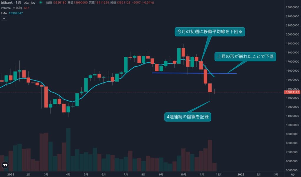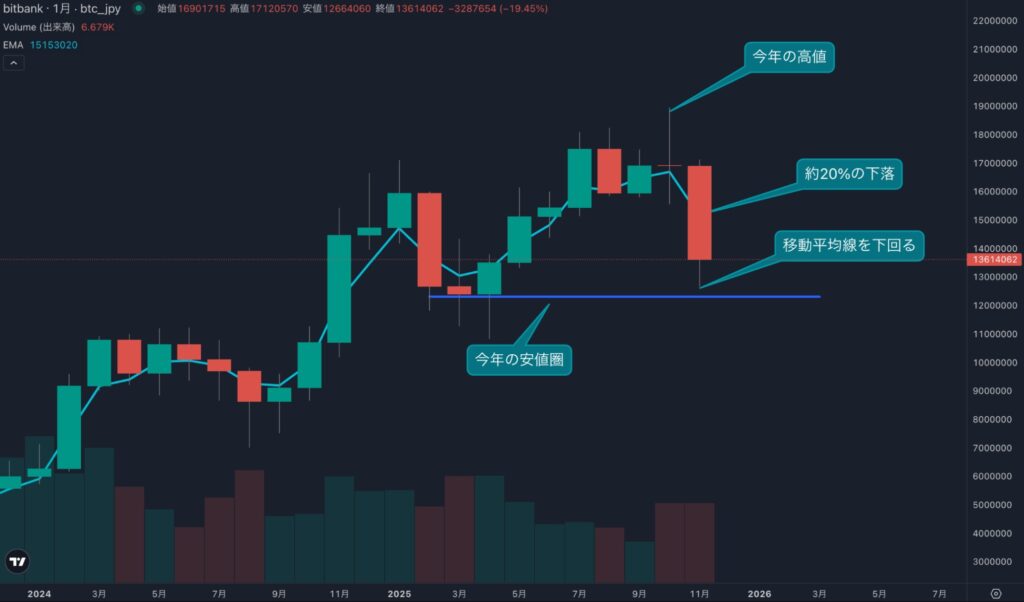 • 今月は初週から売られ、月の後半まで上値が重い展開となりました。初週は1500万円近辺で買い戻しが入り、上昇トレンドの形を維持しましたが、2週目には完全にサポートラインを割り込み下落が加速しました。3週目には一時1300万円を下回りましたが、売られ過ぎから買い戻しが入り、週足は下ひげを付けました。価格は足元で反発の流れとなり、週足の連続陰線を回避する可能性があります。