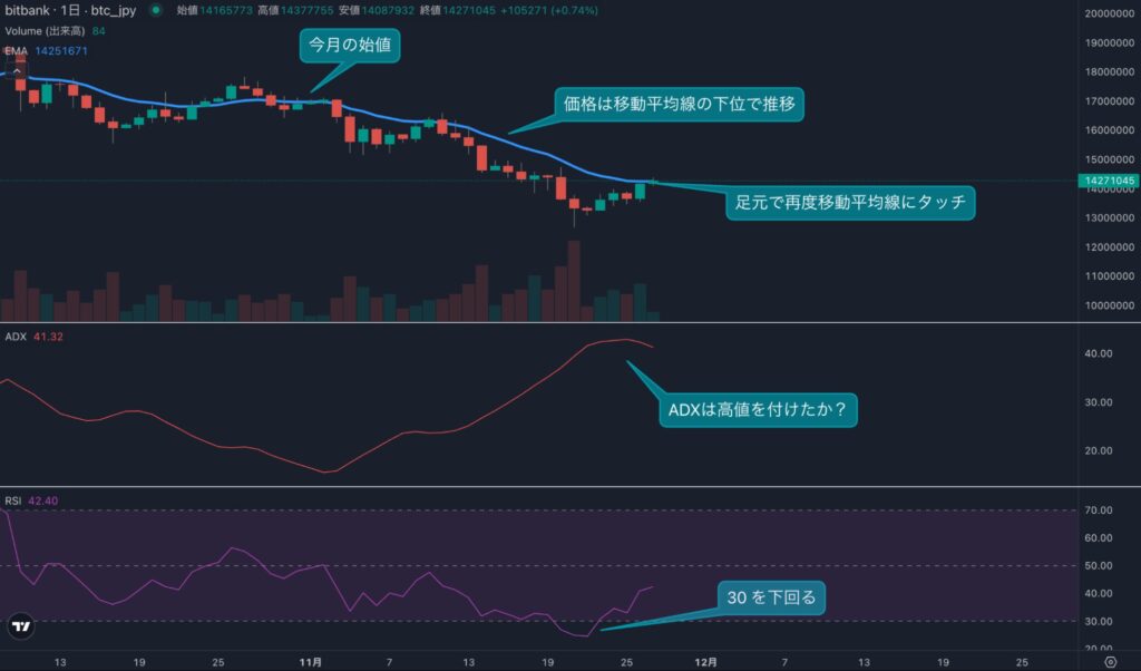 • 今月のビットコイン日足は移動平均線(14EMA)の下位での推移がほとんどでした。移動平均線近辺では上値が重くなり、戻り売りのポイントとなっていました。一方、11月最終週の今週は再度移動平均線を試す動きとなっています。価格は1400万円台を回復し買い戻しの流れとなっています。テクニカル的にはトレンド指数であるADXが40を超え、弱気トレンドの終盤に入っていることを示唆しています。今年のADXの高値は55です。また相場の過熱感を示すRSIは今年2度目となる30を下回りました。30以下は売られ過ぎを意味します。日足テクニカルはトレンドの変化が起こりやすい水準にあることから、短期の買い戻しも入りやすいでしょう。まずは日足が移動平均線の上位を維持できるか注目です。