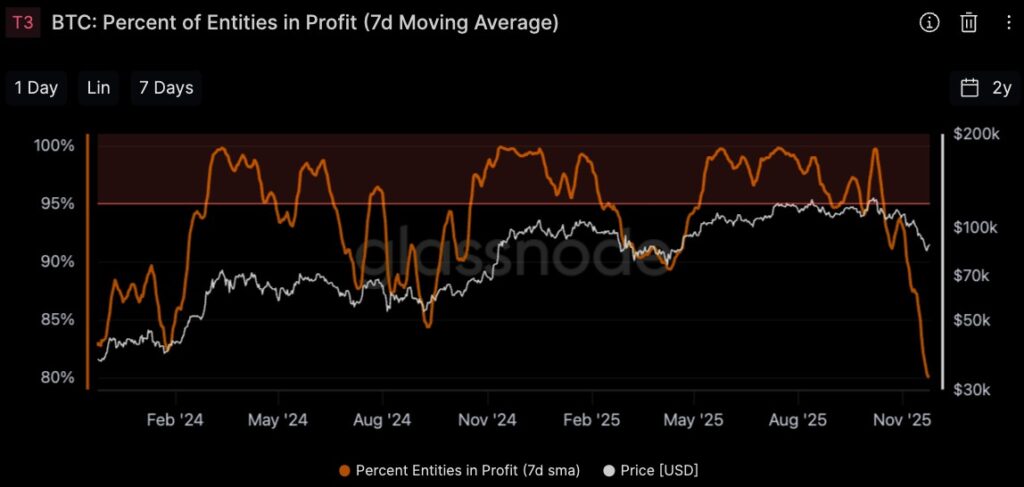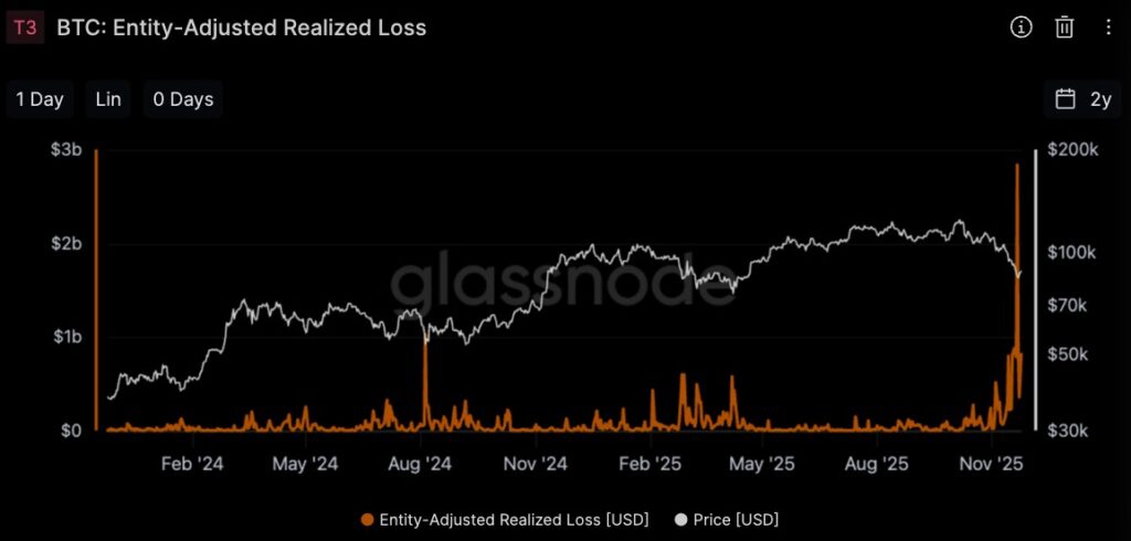 • 上記はビットコインのオンチェーンデータから算出されたチャートとなります。最初の画像では損失が出ている送金額を表しており、ここ2年間で最も高い水準となりました。今年2月に起きたトランプ大統領の関税ショックによる下落時にもここまで大きな送金は見られませんでした。今週は約28億ドルの送金があり、含み損を抱えていた投資家が損失を確定させたものと考えられます。2022年の下落トレンドの底付近でも約24億ドルの損失送金があり、今回の動きもトレンドの動きに影響を与える可能性があります。