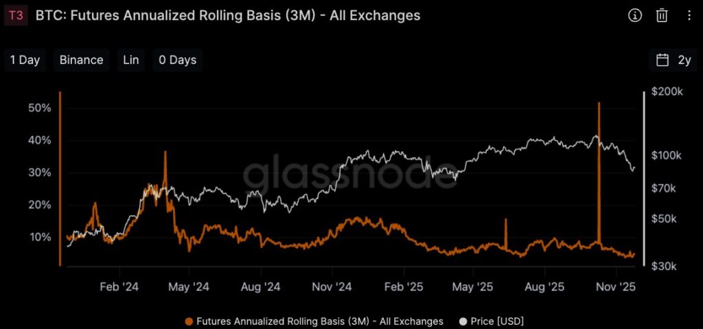 • 3カ月先の先物価格と現物価格の乖離率は現在4.7%で推移しています。今週は3%台で推移することもあり、ここ2年間で最も低い水準です。短期の投機的な買いは解消されたものと考えられます。今年の年初には13%程度で推移していましたが、後半に進むにつれ乖離率は縮小していきました。今年の相場がイマイチ盛り上がらなかった要因として投機筋の買いが少なかったことが考えられますが、価格上昇が少なかった反面、下落した際の変動率も限定的であると考えられます。乖離が以前と比べ縮小傾向にあるのは、ビットコインの変動率自体が低下していることも影響しているでしょう。