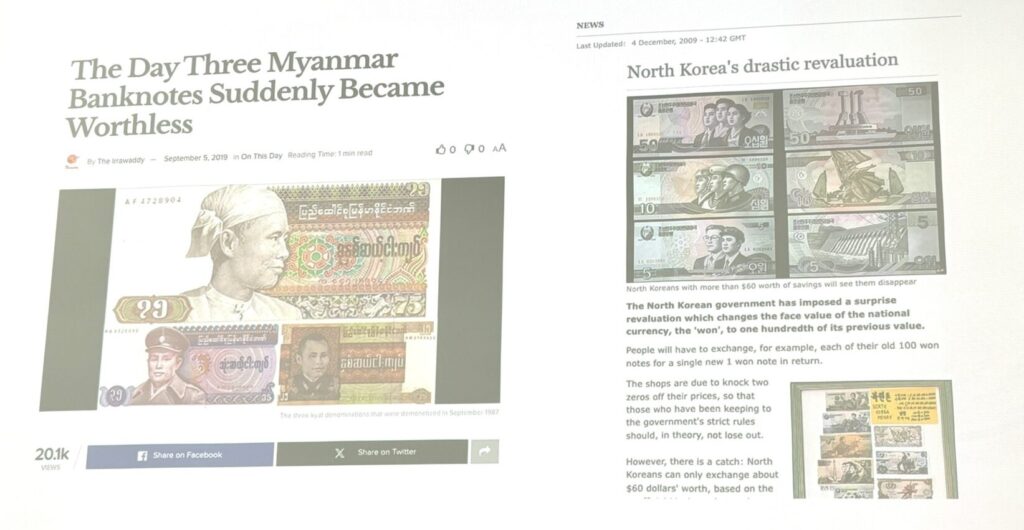 自身の親世代の話として、同国(当時のビルマ)で約40年前に起きた軍事政権による廃貨措置を紹介。特定紙幣が突然無効化されたため、国民の8割が貯蓄を失う事態になったと説明した。