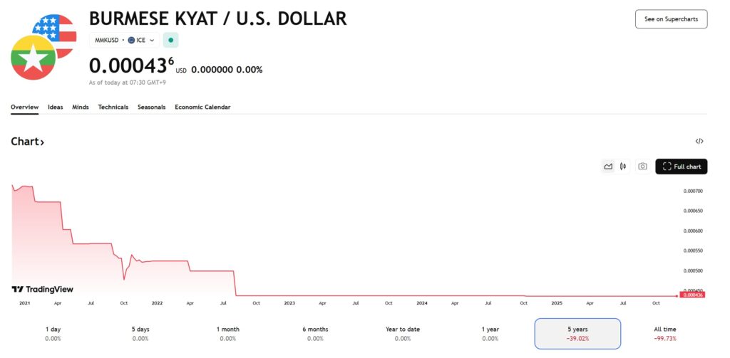 ミャンマーでは2021年2月のクーデター以降、現地通貨チャットが急速に下落した。