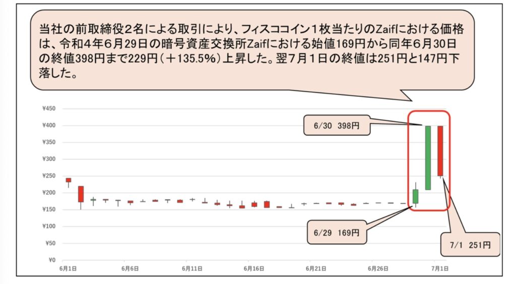 しかし、当時の取締役2名が暗号資産交換所「Zaif」で買い注文を繰り返すことで価格を人為的に引き上げた。同社はこの吊り上げられた価格を根拠に資産価値を算定し、必要な減損処理を免れていた。