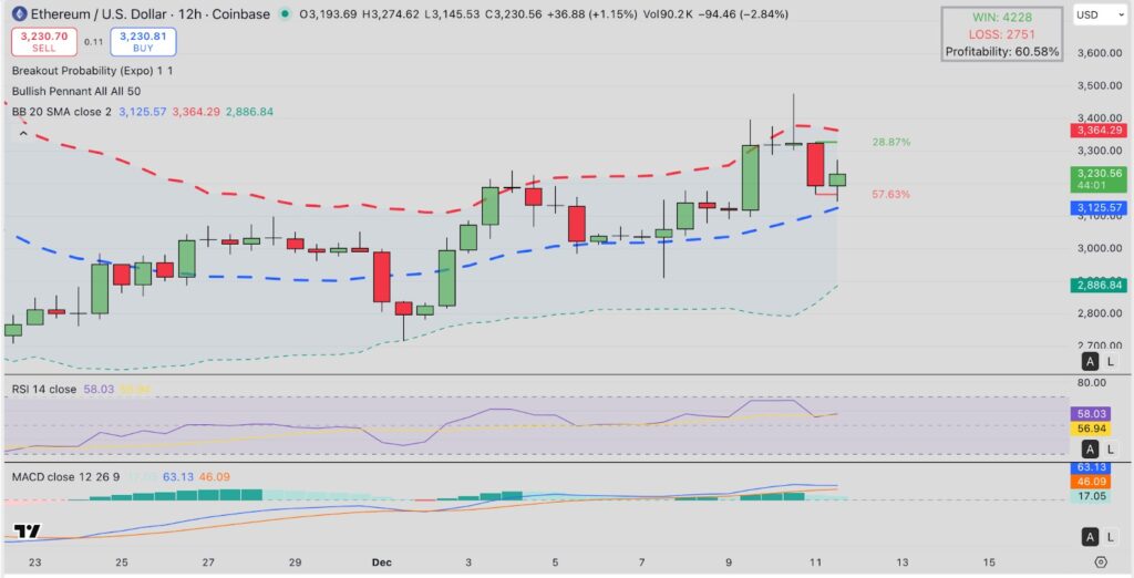 イーサリアムは当記事執筆時点、3227ドルで取引されているが、テクニカル指標は強気モメンタムが弱まっていることを示している。12時間足チャートを見ると、ETHは3125ドル付近にある20期間(20-SMA)のボリンジャーバンド中央値を上回っており、この水準が目先のサポートラインとなっている。ETHの日中のローソク足は、3363ドルにあるボリンジャーバンドの上限抵抗線より下に留まっているため、直近の上昇の試みは制限されている。