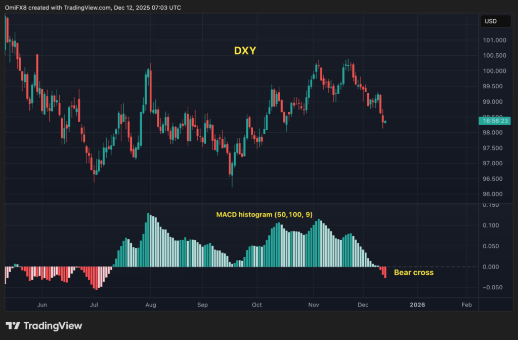 さらに重要なのは、DXYのMACDヒストグラムがマイナスに転じ、勢いが弱気方向に転換したことだ。