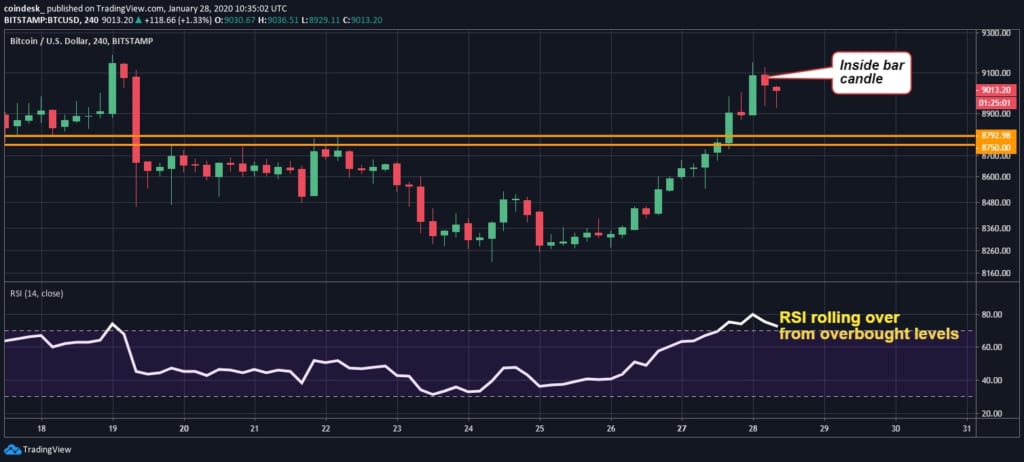 ビットコインは1月28日のアジアの取引時間中に9000ドルの200日移動平均線を超え、9150ドルまで上昇した。月初からの累積損益は25%以上となった。