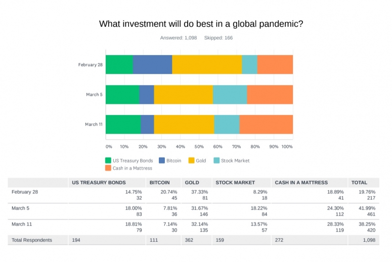 「マットレスの下に隠したキャッシュ」を安全資産と答えた人は、2月は回答者の18%だったが、3月11日までに約27%に急増した。「ゴールド」と回答した人は37%から33%に減少した。この調査は3月12日のゴールド価格の3%の下落よりも以前に行われた。