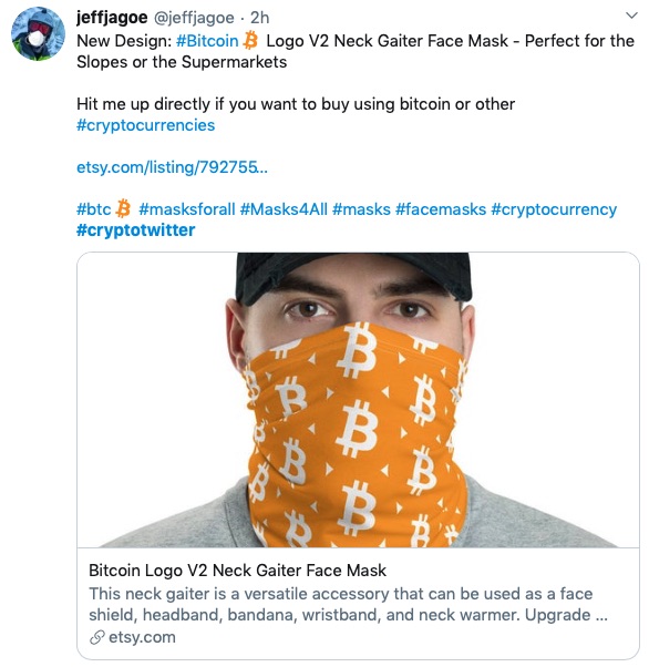 編集注:この20ドルの「ビットコインロゴV2ネックゲートルフェイスマスク」が本物かどうかわからない。仮に本物だとしても、ここに掲載していることは、推薦を意味するものではない。ほぼポリエステル製のバンダナにしては高価に思える。しかし、確かに時代を象徴している。