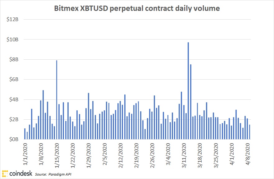 例えば、デリバティブ取引所BitMEXのビットコイン/米ドルの永久スワップ契約の取引高は低くなっている。