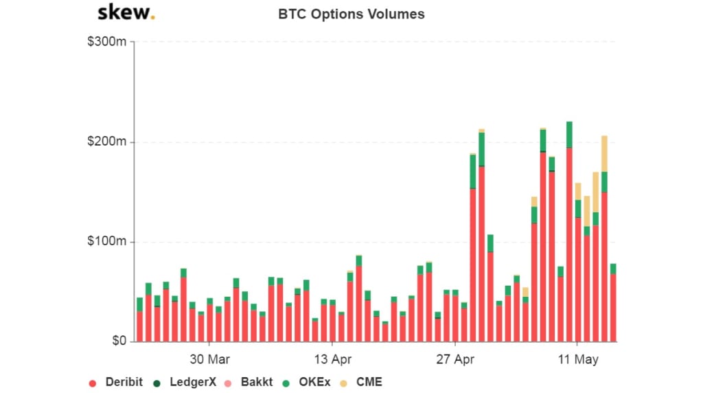 暗号資産(仮想通貨)デリバティブ調査会社スキュー(Skew)のデータによると、シカゴ・マーカンタイル取引所(CME)の1日あたりのオプション取引高は同日、1700万ドルに急増。5月6日に記録した過去最高額の990万ドルを超えた。