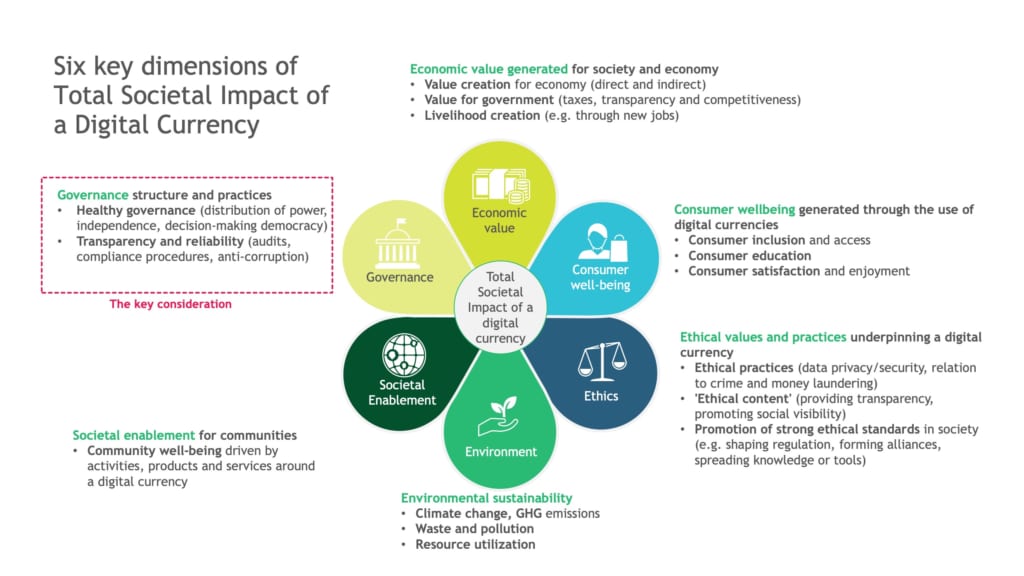 さらに、デジタル通貨の導入による社会的バリューチェーンへの影響と、国家、中央銀行、企業、個人ユーザーによる採用の潜在的効果を理解するために、我々は「トータル・ソーシャル・インパクト(Total Social Impact:TSI)」フレームワークを開発した。そしてデジタル通貨の基礎となる具体的な要素を定義し、TSIを使って分析した。