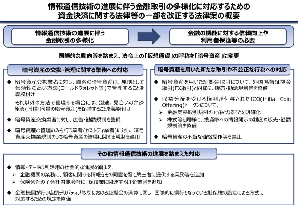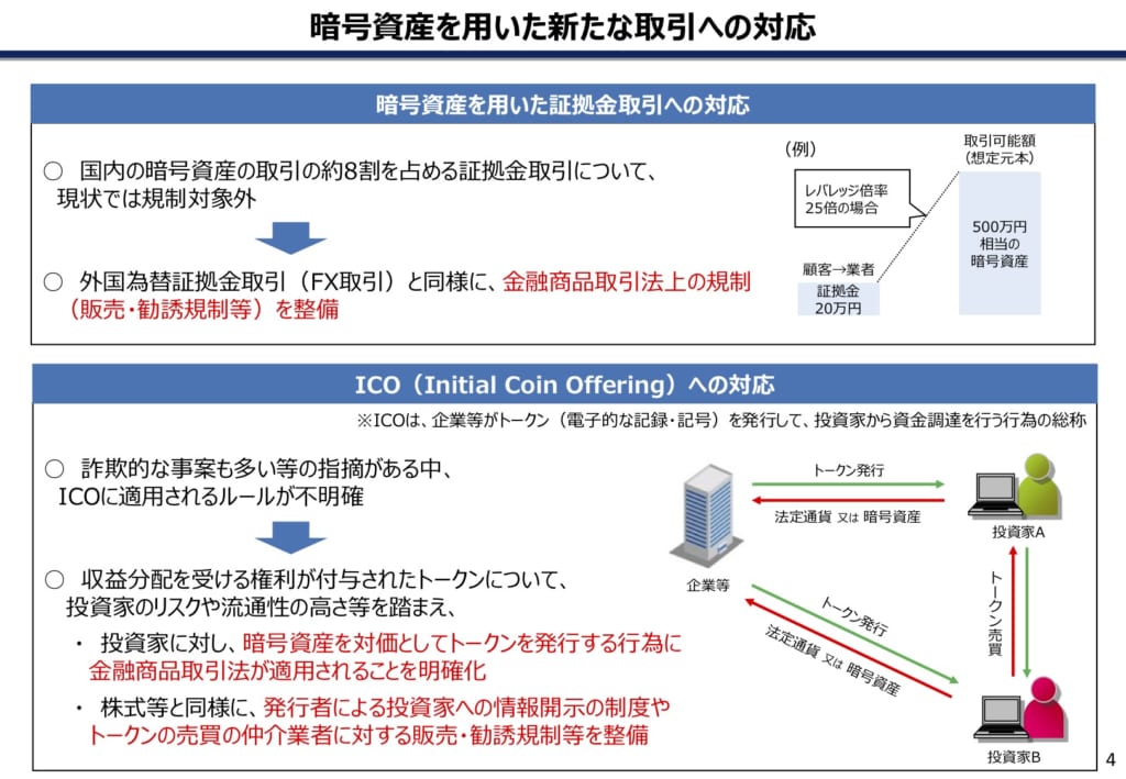 今回の改正案に関する説明資料では、「ICOの対応」として「金融商品取引規制の対象となることを明確化」と述べられており、「株式等と同様に、発行者による投資家への情報開示の制度やトークンの売買の仲介業者に対する販売・勧誘規制等を整備」とかなり厳しいルールが整備される見込みだ。