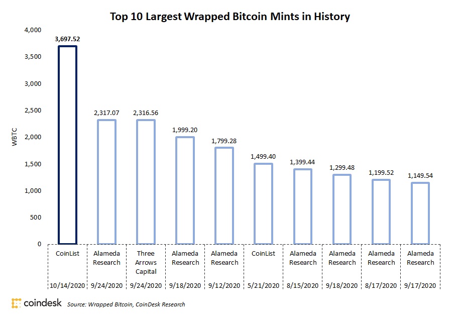 CoinDeskによる取引データの分析によると、これまでの記録は9月18日にアルメダ・リサーチ(Alameda Research)が3回に分けて発行した4093WBTC(4470万ドル、約47億円)。