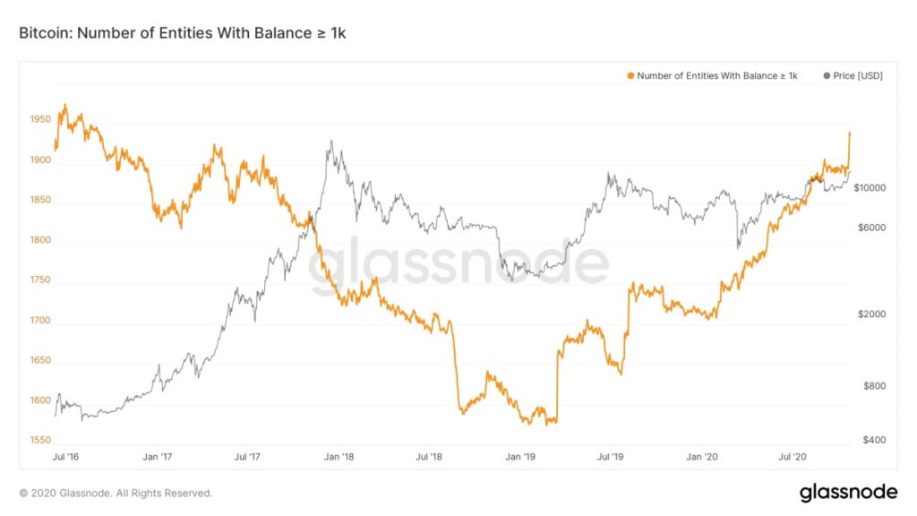 データサイトのグラスノード(Glassnode)によると、最低1000ビットコインを保有するクジラの数は10月25日時点で1939。2016年9月以来の水準を記録した。ビットコインの価格は先週、13%以上の上昇となり、週としては4月以来、最高のパフォーマンスを記録。