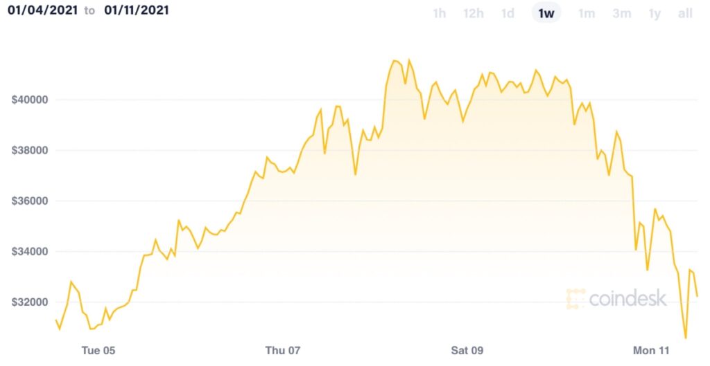ビットコインの価格は、協定世界時10日22時(日本時間11日7時)の3万8947ドルから、協定世界時11日17時(日本時間12日2時)には3万305ドルとなり、19時間で8642ドル(22%以上)の下落となった。