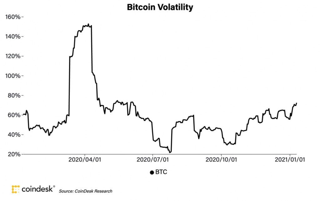 11日、ビットコインが大幅に上昇し、その後に下落したことで、市場のボラティリティ要因は拡大した。ビットコインの30日ボラティリティは、71.9%まで上昇し、2020年6月5日以来の水準となった。