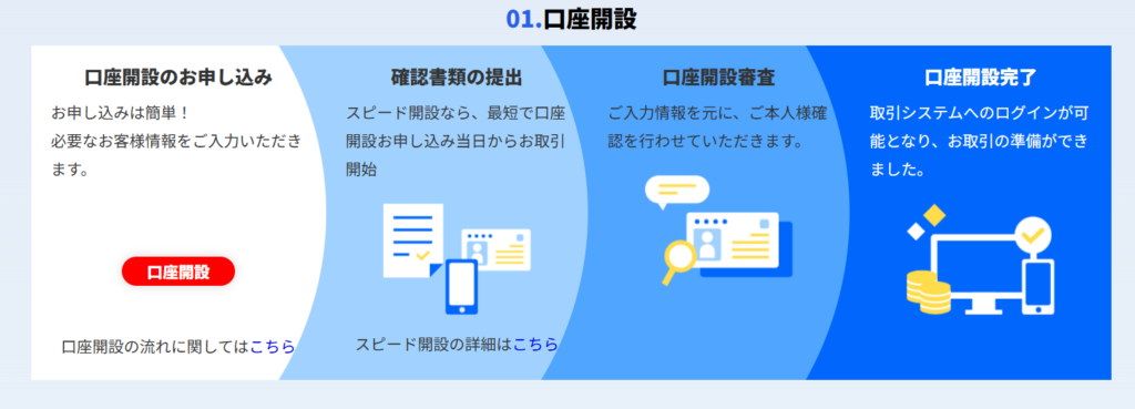 本人確認書類はマイナンバーカードが必要であり、スマホからできるスピード開設と、書類のアップロード・Eメール・郵送などの手段で確認する通常開設の2種類の方法で行える。審査結果は最短で申し込み当日に届き、証拠金を入金することで取引を開始できる。