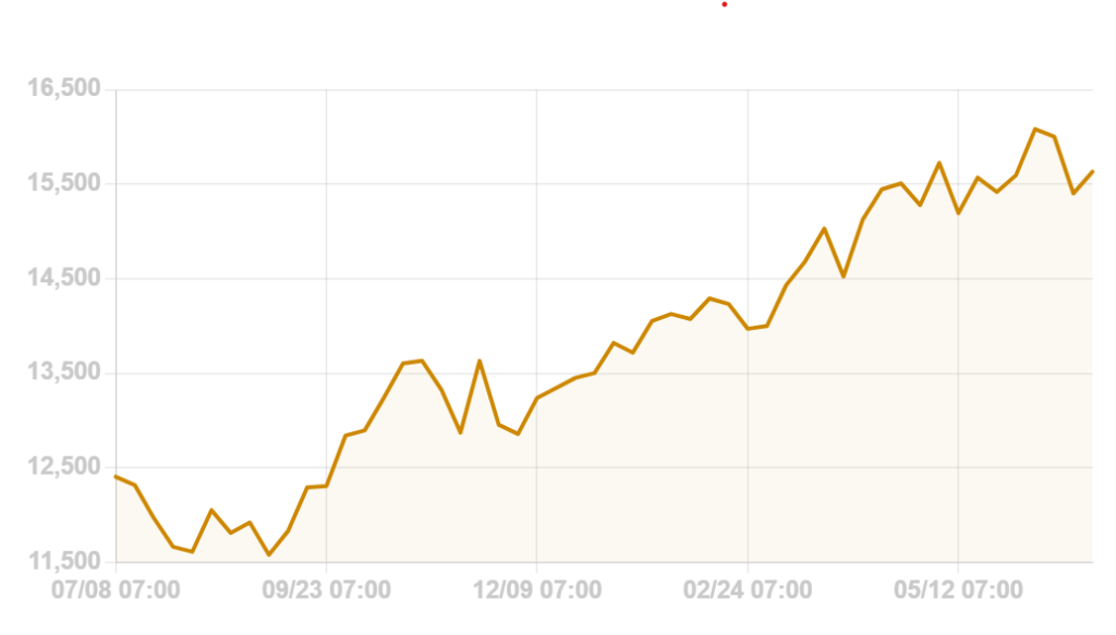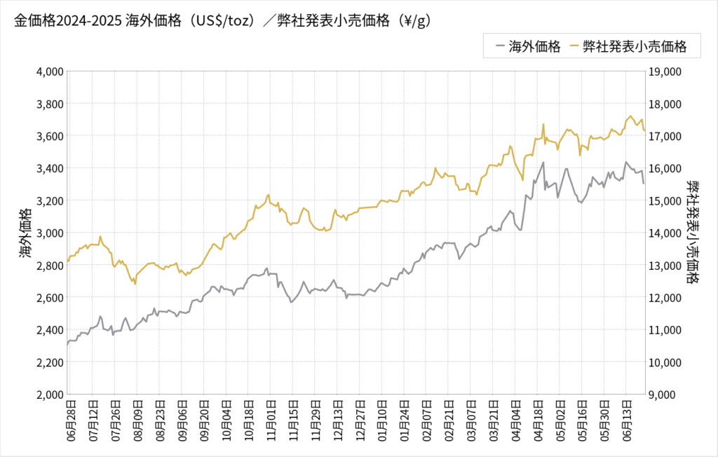 ジパングコイン(ZPG)の2024年7月から2025年7月までの価格変動を表したチャートである。近年の金価格上昇傾向に伴い、ジパングコイン(ZPG)の値動きも上昇している。さらに2024年から2025年までの金価格のチャートと比較する。