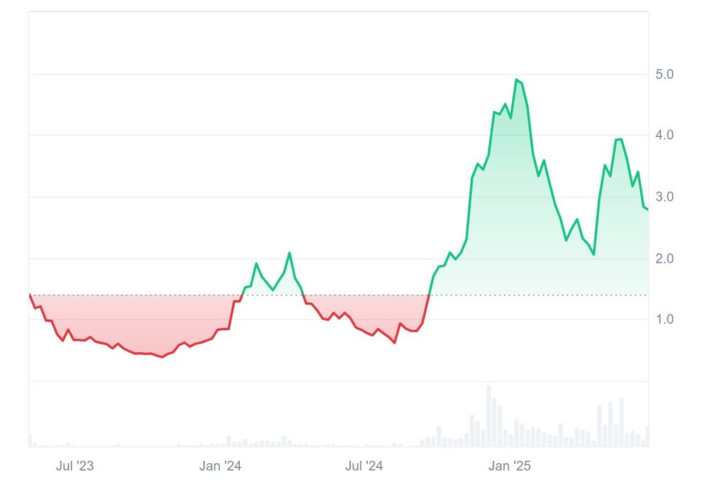 以下がスイ(SUI)の過去の値動きである。スイ(SUI)の価格は、2023年10月に1SUI=0.40ドルを割って底を打ったあと、2024年にかけて価格が大きく上昇させた。2024年2月に1SUI=1.90ドル台に達し、その後、2025年1月には過去最高値となる1SUI=5.35ドルに達するなど、大幅な上昇を見せた。2025年6月時点では約3ドル前後で推移している。