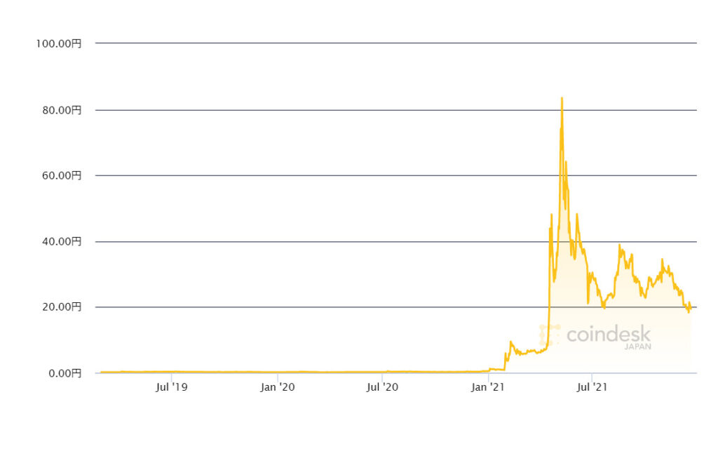 2017年のビットコインバブルなどの仮想通貨が上昇する局面ではビットコインと連動する形で上昇してきたが、2021年にテスラ創業者のイーロン・マスク氏がドージコインについて言及したことが材料となり、これまでにない高騰を見せた。